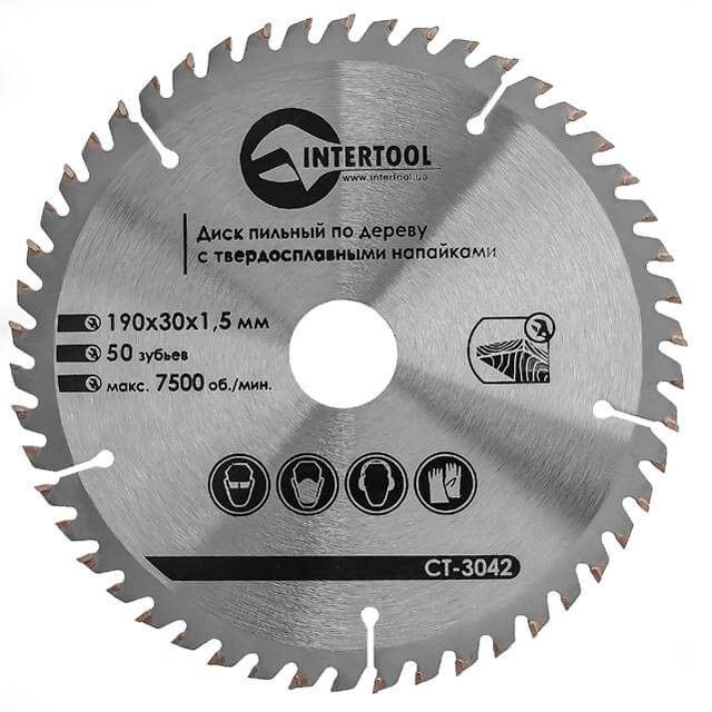 Диск пильний по деревині із твердосплавними напайками 190x30x1.5 мм , 50 зубів, 7500об/хв INTERTOOL CT-3042