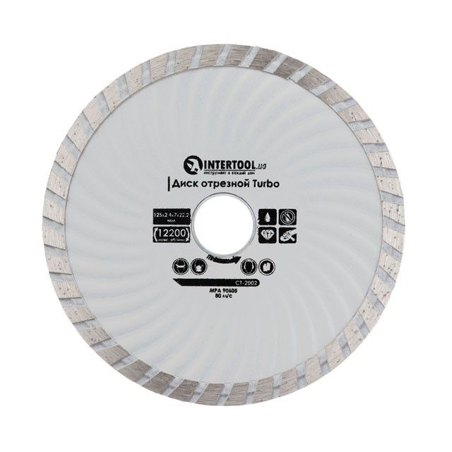 Алмазний відрізний диск TURBO INTERTOOL CT-2002 діаметром 125 мм призначений для використання з кутовими шліфмашинами з високою швидкістю обертання, а також з бензиновими ручними відрізними машинами. Перевагою алмазних дисків класу TURBO є більш висока швидкість різання при роботах з каменем, цеглою і бетоном. Наявність спеціальних каналів допомагає швидко відводити пил у процесі різання. Склад металу самого диска, а також суцільний алмазомісткий шар відрізного круга гофрований, що дозволяє витримувати серйозне силове і теплове навантаження и дає можливість здійснювати роботи з різання бетону і цегли сухим способом, не охолоджуючи алмазний турбо-диск. Також їх можна застосовувати і для мокрого типу різання. Насичення алмазною крихтою - до 18%.