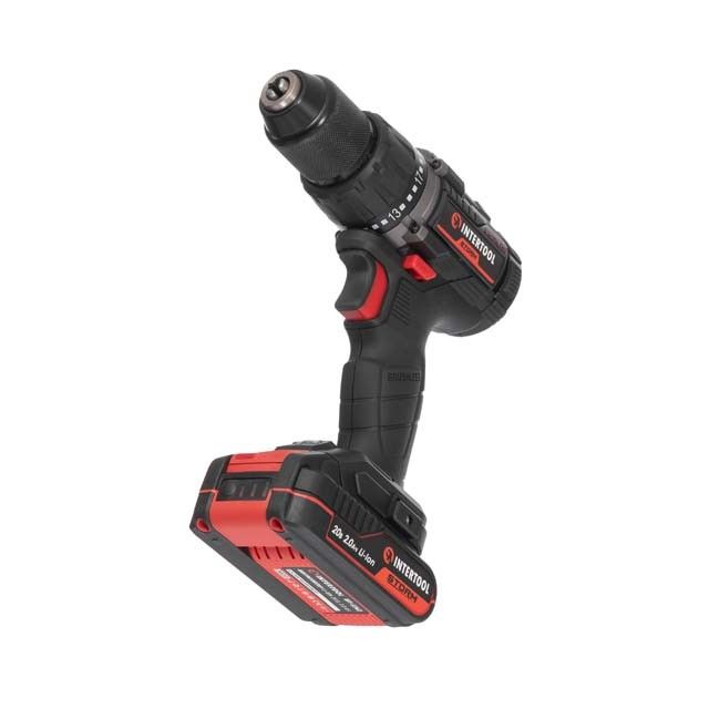 Дриль-шурупокрут акумуляторний з безщітковим двигуном 20 В, 60 Нм, 0-500/0-2000 об/хв, 2-13 мм, Li-Ion, 2.0 Аг, ЗП 2 А, кейс INTERTOOL WT-0360