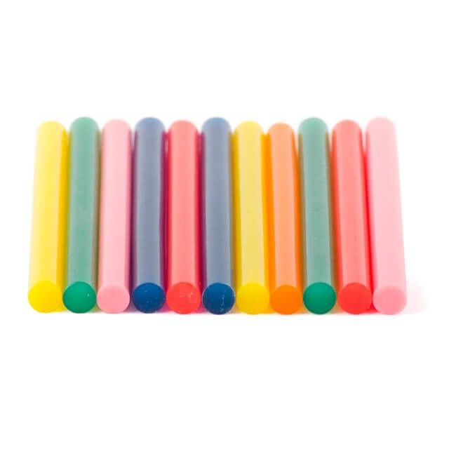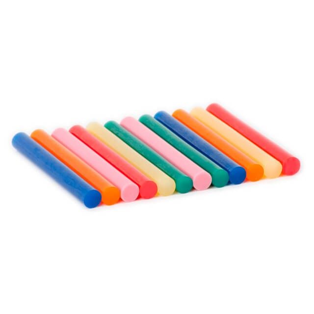 Термоклей кольоровий: синій, зелений, оранжевий, червоний, жовтий, рожевий. В упаковці по 2 стержні кожного з кольорів.