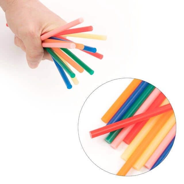 Термоклей кольоровий: синій, зелений, оранжевий, червоний, жовтий, рожевий. В упаковці по 2 стержні кожного з кольорів.