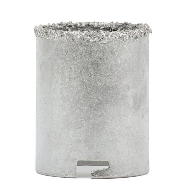 Корончасті свердла (фрези) виготовлені з високоякісної інструментальної сталі, стійко переносять фізичні навантаження. Ріжуча частина рівномірно вкрита карбід-вольфрамової крихтою, яка забезпечує комфортне свердління без сколів та тріщин. Направляюче свердло не дає коронці йти в сторону та дозволяє робити рівні отвори. Глибина свердління 64 мм.