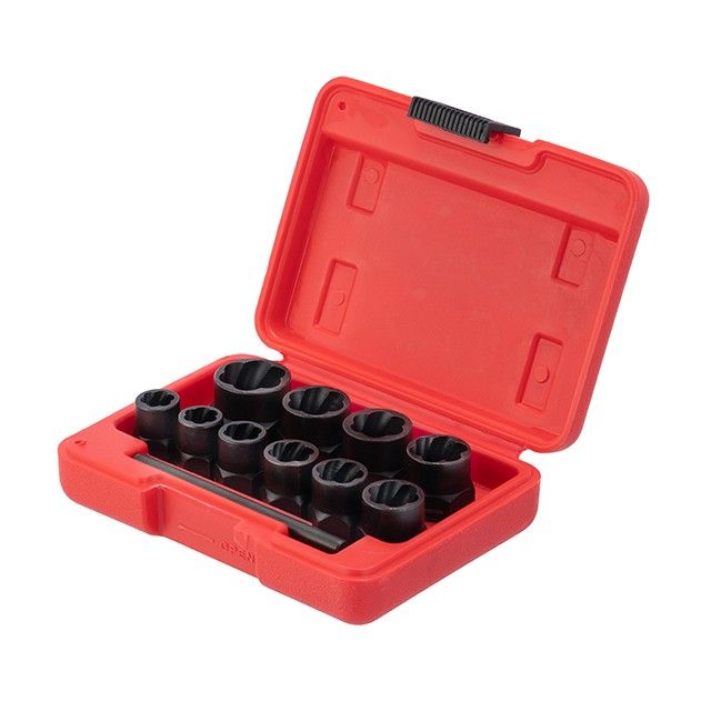 Набір подовжених екстракторів для пошкоджених болтів і гайок SD-8008 необхідний для демонтажу болтів і гайок, що пошкоджені чи мають стерті грані. Набір містить 10 екстракторів діаметром 9, 10, 11, 12, 13, 14, 15, 16, 17, 19 мм і виколотку для витягування застряглих кріплень. Всі елементі набору виготовлені з хром молібденової сталі, яка гарантує високу міцність і тривалий термін служби. Подовжена форма екстракторів дозволяє діставати глибоко посаджені болті і гайки.