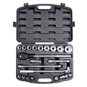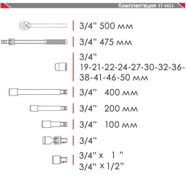 Професійний набір інструментів INTERTOOL ET-6023 включає 20 одиниць, призначених для ремонту вантажівок та іншої важкої техніки. Інструменти, що входять до складу даного набору, відрізняються великими розмірами та виключно високою якістю. Так, торцеві головки, представлені в кількості 9 штук, мають діаметр від 19 до 50 мм, виготовлені з хром-ванадієвої сталі, що володіє високою міцністю та стійкістю до корозії. Крім того, в професійний набір інструменту INTERTOOL ET-6023 входять вороток, три подовжувача, рукоятка з храповим механізмом, перехідники та кардан. Розмір посадкового квадрата - 3/4". Набір поставляється в кейсі з ударостійкого пластику.