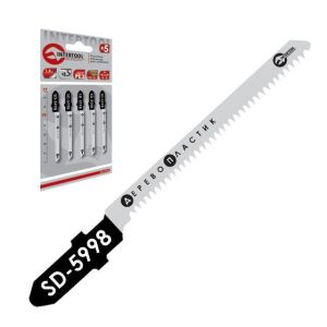 Пильне полотно SD-5998 – витратний матеріал електричного лобзика, який призначений для роботи по деревині і пластику. Полотно має спеціальну форму, за рахунок чого досягається мінімальна відстань між зубцями. Загальна довжина полотна складає 77 мм, а робоча – 50 мм. Полотно поставляється в картонній упаковці. Кількість полотен в упаковці – 5 одиниць.