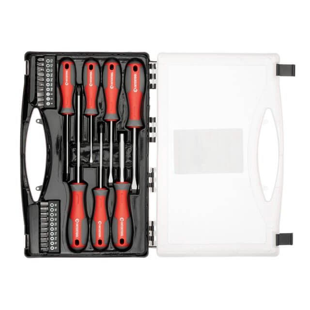 Набір упакований в компактний кейс (330*220*50 мм) з ручкою для транспортування та двома застібками. Викрутки розміщені в особистих кріпленнях, біти знаходяться в тримачах. Під час транспортування нічого не випадає і не губиться. Маркування біт в тримачах дозволяє швидко знайти необхідну насадку.