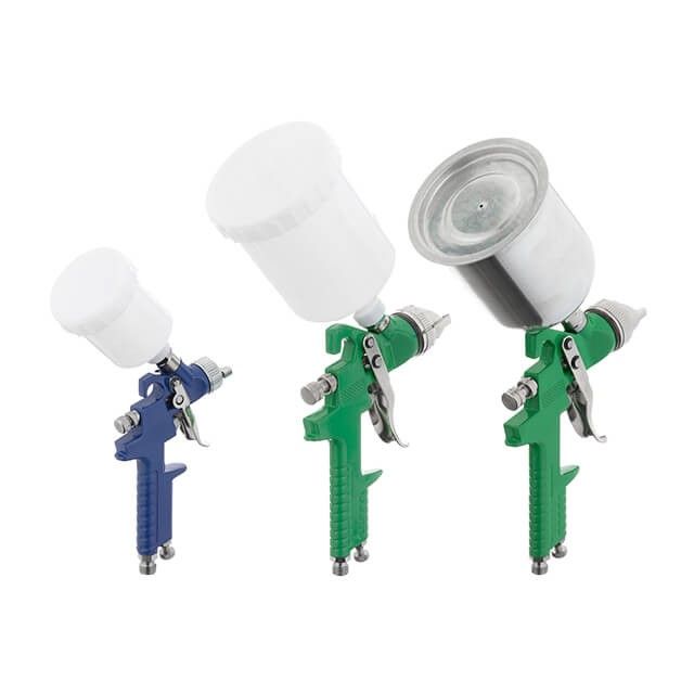 В комплекті два пістолети HVLP з діаметрами форсунок 1,3 та 1,7 мм з двома різними бачками (600 мл) - металевий і пластиковий, а також пістолет HVLP mini з форсункою 0,8 мм (125 мл).