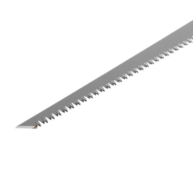 Ножівка для гіпсокартону HT-3121 має дуже скромні габаритні розміри і з легкістю виконує покладені на неї завдання. Дана модель має чудову ергономіку — зручна і практична прогумована рукоятка забезпечує комфорт в роботі. Полотно ножівки HT-3121 виготовлене з надміцної сталі з твердістю 55 HRC, а його робоча довжина — 150 мм. Шаг зубців — 7 од. на 1 дюйм.