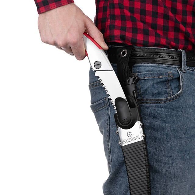 Ножівка завжди з собою та не заважає, коли руки повинні бути вільними, завдяки чохлу та поворотному кріпленню до пояса.