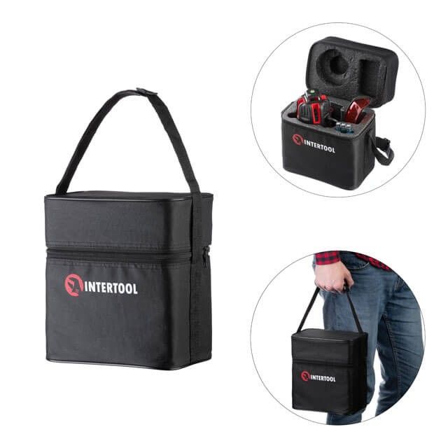 Комплектація:нейлоновий чохол для транспортування з ручкою для перенесення; окуляри для поліпшення видимості лазерного променю; рівень лазерний з підставкою на три опорні ніжки; зарядка + перехідник на micro USB; 3 батарейки 1,5 В (АА); інструкція