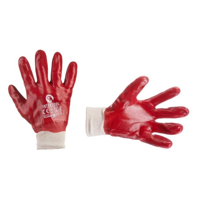 Рукавички INTERTOOL SP-0006 на трикотажній основі. Повністю вкриті високоякісним ПВХ червоного кольору, що забезпечує еластичність і стійкість рукавичок до впливу масел і нафтопродуктів, в тому числі і сирої нафти. Призначені для високих стираючих навантажень, важких робіт.