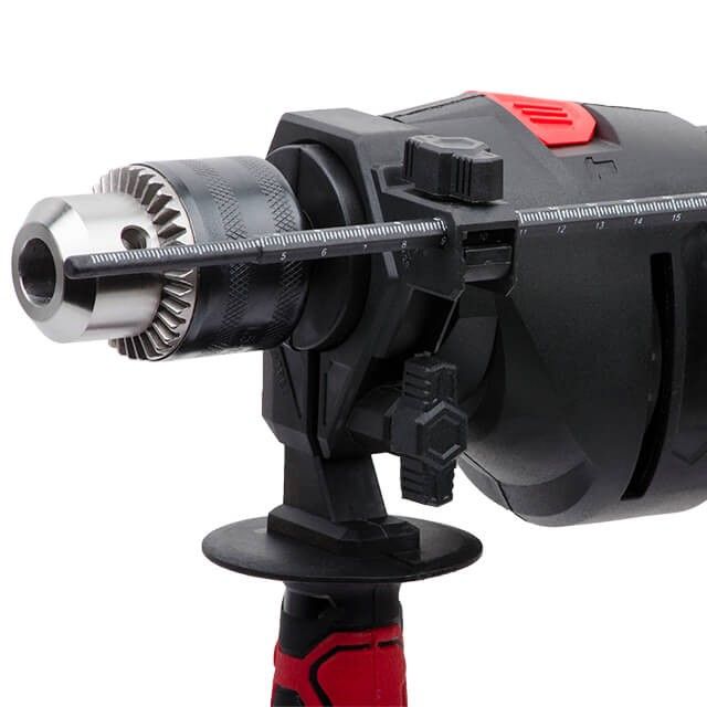 - Можливості дриля розширені: регулятором та обмежувачем обертів, кнопкою реверса, двома режимами свердління (з ударом або без нього), фіксатором пускової кнопки, додатковою рукояткою та обмежувачем глибини свердління.