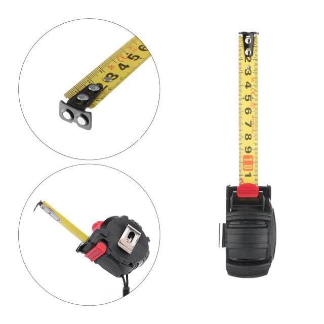 Робити виміри такий рулеткою зручно та легко, оскільки кнопки фіксації полотна знаходяться в близькому доступі для пальців, розміщені зверху та знизу на корпусі. Магнітний зачеп забезпечує надійне зчеплення з металом під час вимірювань.
