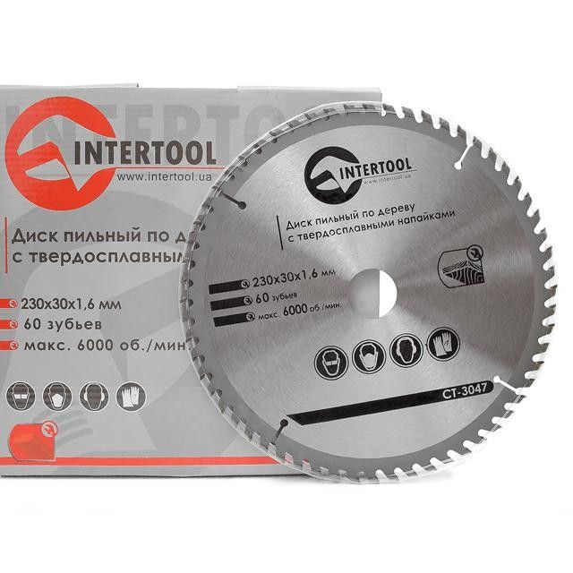 Диск пильний по деревині із твердосплавними напайками 230x30x1.6 мм, 60 зубів, 6000об/хв INTERTOOL CT-3047