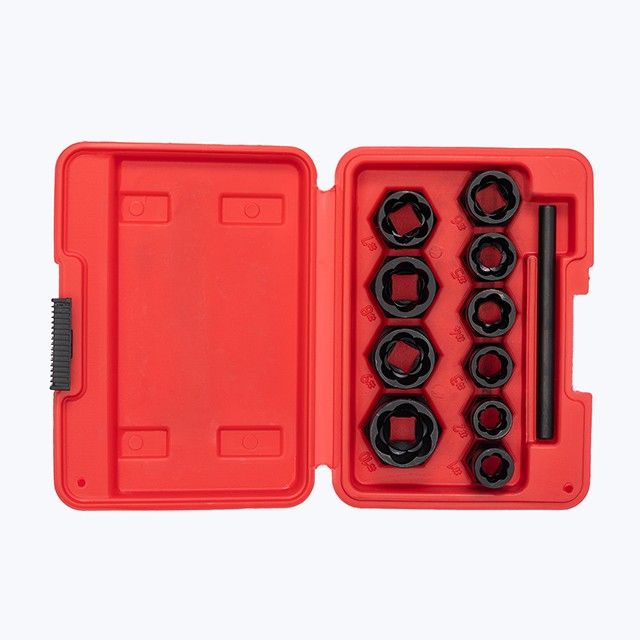 Набір подовжених екстракторів для пошкоджених болтів і гайок SD-8008 необхідний для демонтажу болтів і гайок, що пошкоджені чи мають стерті грані. Набір містить 10 екстракторів діаметром 9, 10, 11, 12, 13, 14, 15, 16, 17, 19 мм і виколотку для витягування застряглих кріплень. Всі елементі набору виготовлені з хром молібденової сталі, яка гарантує високу міцність і тривалий термін служби. Подовжена форма екстракторів дозволяє діставати глибоко посаджені болті і гайки.