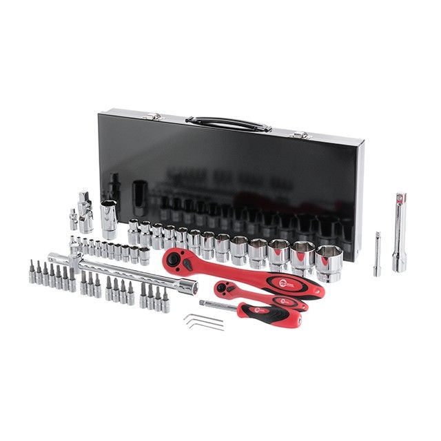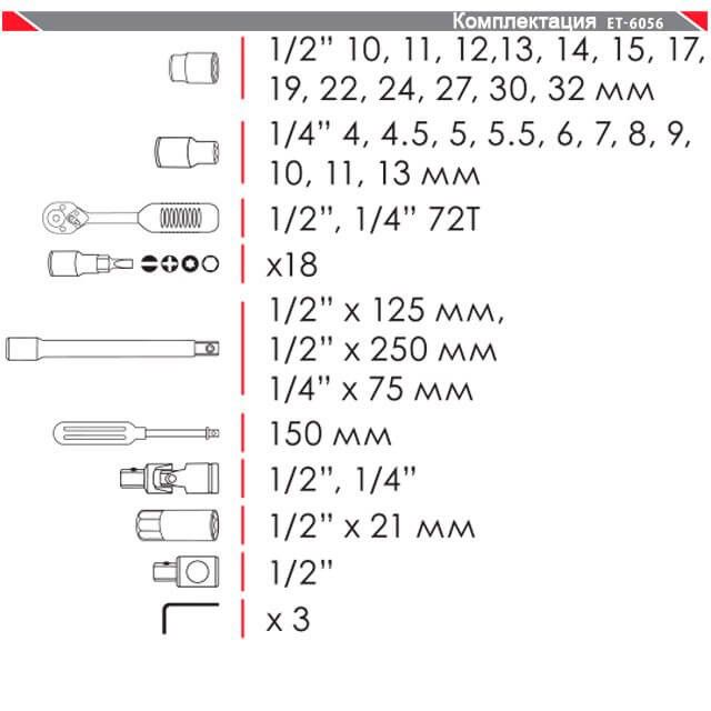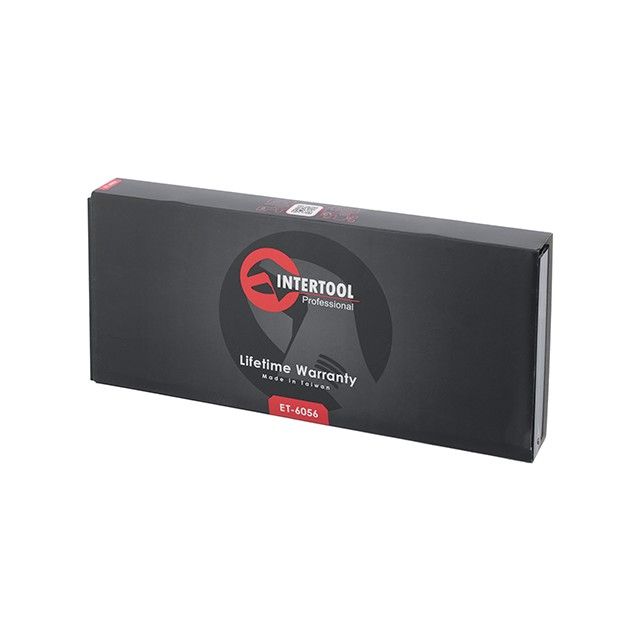 Професійний набір інструментів INTERTOOL ET-6056 включає в себе 56 одиниць інструменту з посадковими квадратами 1/2" та 1/4". Вирізняються незмінною якістю, зручністю в роботі та високими експлуатаційними характеристиками. Всі інструменти, біти та головки виготовлені з хром-ванадієвої сталі підвищеної міцності зі спеціальним покриттям, що захищає їх від корозії. Основну увагу в даному наборі приділено торцевих головкам та бітам. Перші представлені у кількості 24 одиниці, діаметром від 4 до 32 мм. Біт в наборі - 18 одиниць. Окрему увагу заслуговує рукоятка з храповим механізмом (тріскачка) на 72 зубця з можливістю скидання та фіксації торцевих головок. Вона також виготовлена з хром-ванадієвої сталі, вкрита захисним шаром з поліпропілену, що повністю запобігає появі корозії.
