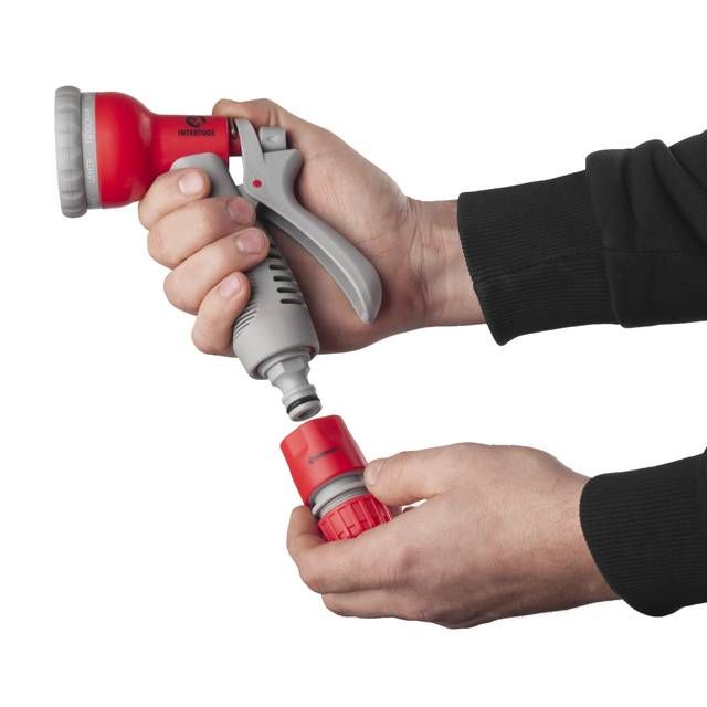 Пістолет-розпилювач для поливу INTERTOOL GE-0002 виготовлений з високоякісних матеріалів. Може працювати у 8-ми режимах поливу – плавна градація від сконцентрованого струменя до розпилення. В комплекті з універсальним адаптером з внутрішньою різьбою 1/2" і 3/4", конектором 1/2" для шланга 1/2" і конектором з аквастопом 1/2" для шланга 1/2" дозволяє швидко, без використання додаткових інструментів підключити даний зрошувальний аксесуар до системи поливу.