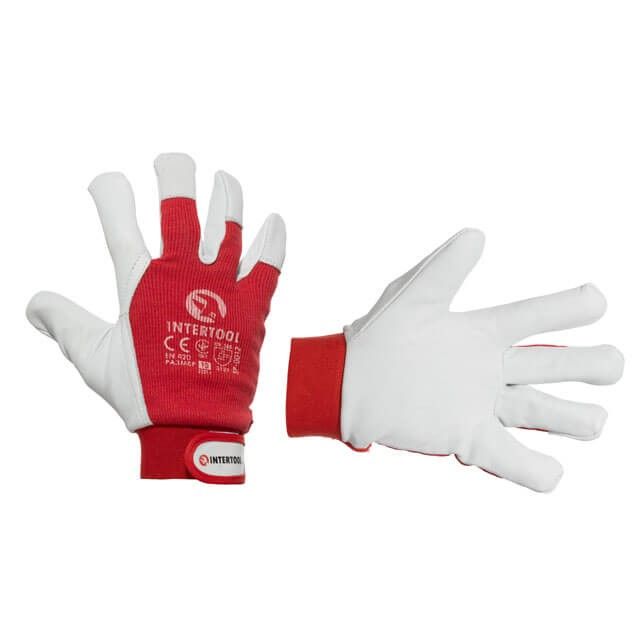 Рукавички INTERTOOL SP-0012 виготовлені з високоякісної білої шкіри з тканинними вставками червоного кольору. Призначені для виконання будівельних і побутових робіт. Зручний крій робить рукавички еластичними, що дозволяє не сковувати рухи пальців. Використання високоякісних матеріалів надійно захищає руки від механічних пошкоджень і забруднень. Еластична манжета на липучці забезпечує надійну фіксацію рукавичок на зап'ясті.