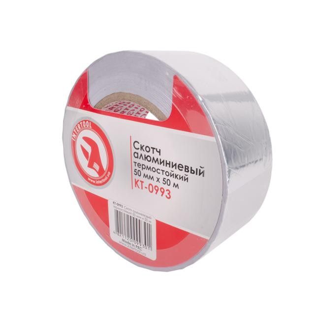 Завдяки такому складу алюмінієвий скотч INTERTOOL KT-0993 шириною 50 мм і довжиною 50 м має високу стійкість до ультрафіолету, вологи, температурному и атмосферному впливу, а його максимальна робоча температура складає 120 °С. Завдяки таким властивостям даний скотч використовується для ізоляції стиків, швів і з'єднань в системах охолодження, кондиціювання, опалення і вентиляції, а також під час монтажу холодильного чи опалювального обладнання і фольгованих систем термоізоляції.