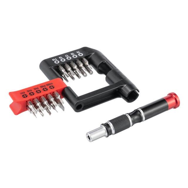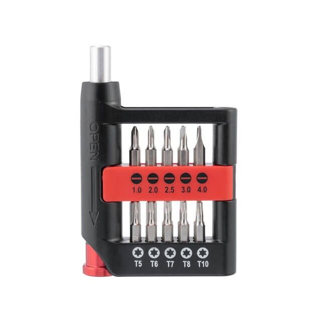 Набор поставляється в компактному, маленькому кейсі, який поміститься в будь-який карман куртки чи штанів. Біти розміщені у власних пазах на планках і не випадають. Ви швидко знайдете необхідну насадку завдяки нанесеному маркуванню. Габарити набора: 65х70 мм, при цьому довжина викрутки 95 мм.