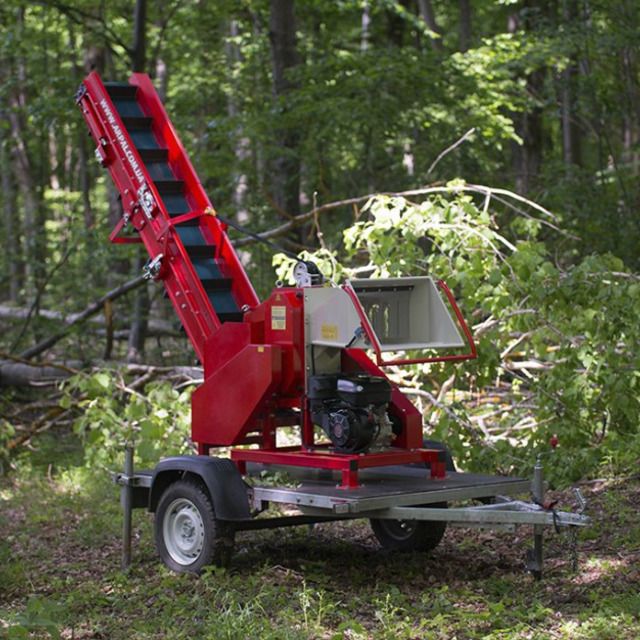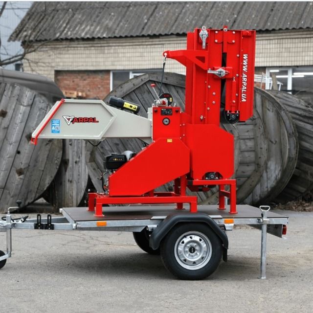Подрібнювач гілок АМ-120БД-К PRO встановлений на автомобільний причіп, що дозволяє переміщати подрібнювач гілок на великі відстані безпосередньо до місця переробки сировини. Причіп є сертифікованим та підлягає обовʼязковій реєстрації як транспортний засіб. Ви також можете замовити подрібнювач гілок АМ-120БД-К PRO в комплектації без причіпа.