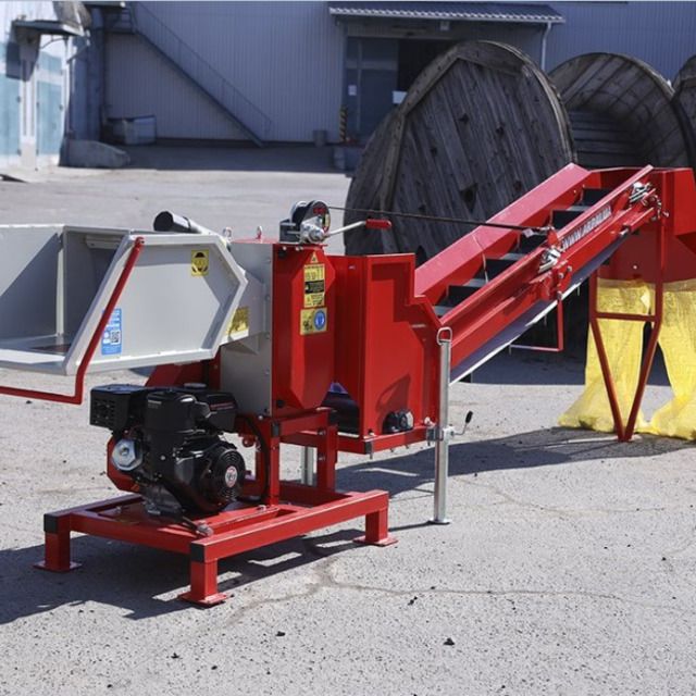 Подрібнювач гілок обладнаний транспортером, який дозволяє подавати порубану сировину одразу на причіп автомобіля, або в спеціальну ємність (контейнер, біг-бег). Транспортер дозволяє значно підвищити продуктивність праці та скоротити кількість персоналу при роботі з подрібнювачем гілок. При виробництві транспортерів ми використовуємо тільки якісні ПВХ стрічки виробництва Польщі та Голландії. Транспортер має складну конструкцію і в робочому положенні довжини та висоти підйому транспортера достатньо для завантаження подрібнених гілок в кузов вантажного автомобіля, або причеп. Висота підйому подрібненої сировини складає 3 метра. При транспортуванні та зберіганні, транспортер складається. Для попередження випадання сировини, встановлені додаткові борти в місці подачі перероблених гілок на транспортувальну стрічку. Транспортер може бути додатково укомплектований вихідним бункером під мішки. В стандартну комплектацію він не входить.